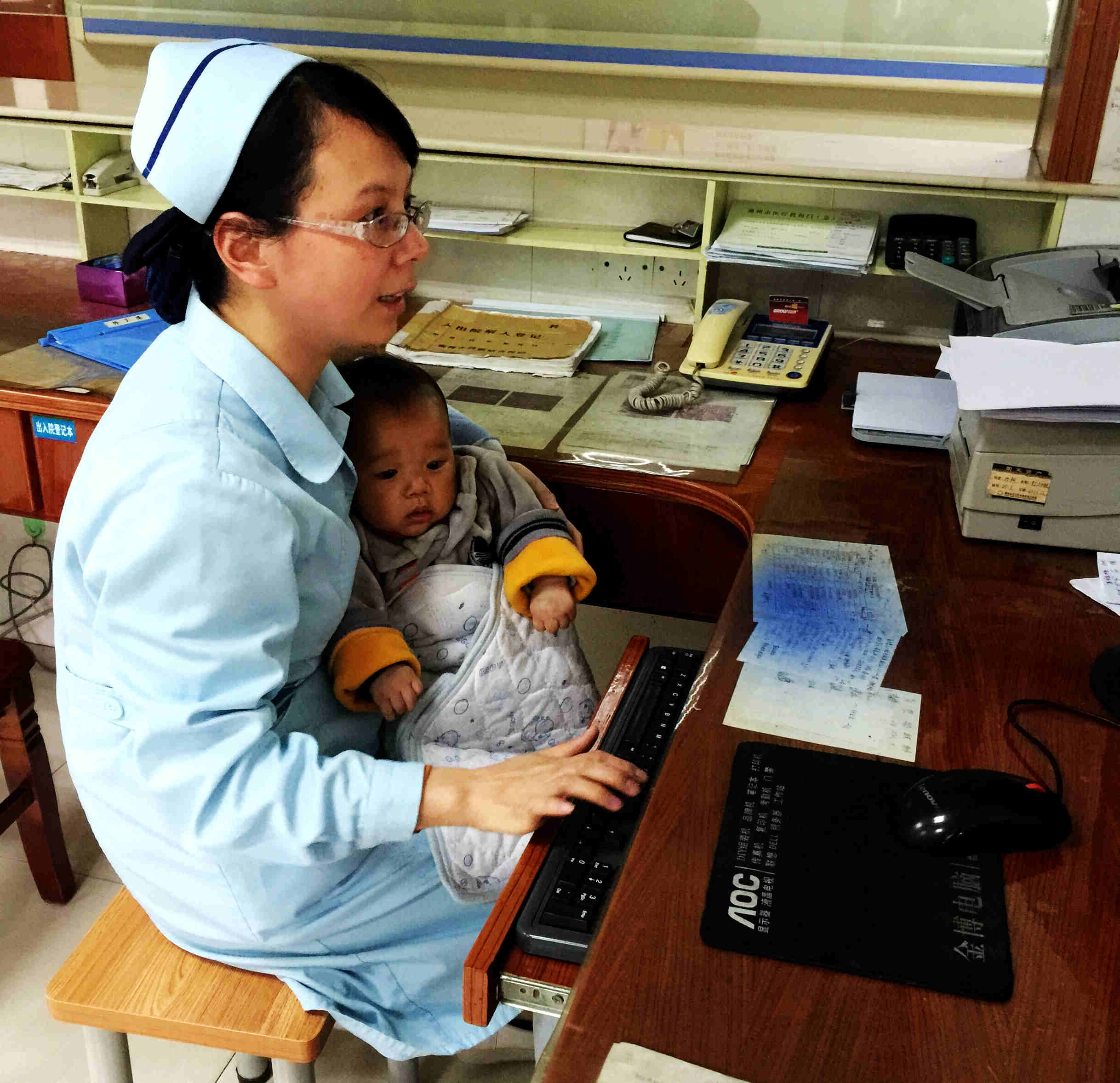 4月14日下午,我院外科病区的护士们和往常一样忙碌着,迎接新病人,处理医嘱,发药,挂水……病房内有个特殊的病人,一位来自贵州的年轻妈妈王女士,和丈夫一起来南浔打工,身边还带着一个还不能走路的宝宝。前些日子王女士无意中发现自己颈部有一个肿块,医生告诉她需要手术治疗。丈夫在工厂打工无法长时间陪在病房,在住院期间王女士常常一人带着六七个月大的宝宝。术前王女士需要做B超、拍片检查,带着宝宝非常不方便,正在焦头烂额的时候,外科护士长徐斌斌主动提出为她帮忙照看孩子。于是有了这么温馨的一幕:护士长怀抱着宝宝在电脑前工作着,护士站里紧张而又忙碌的气氛温暖了起来。这张照片是外科护士孔林华偷偷拍下并传到医院内网的。